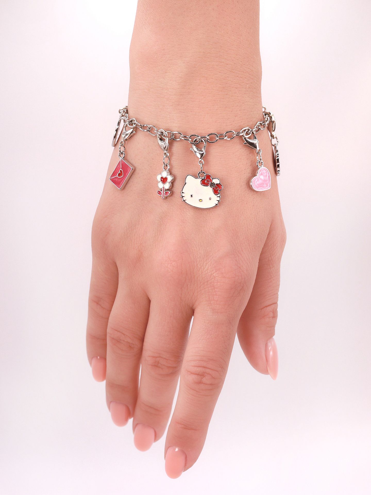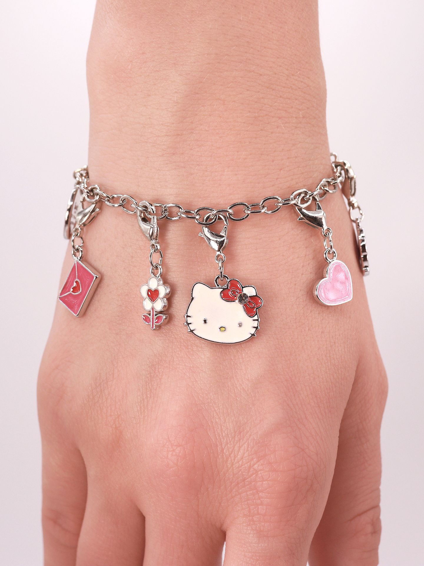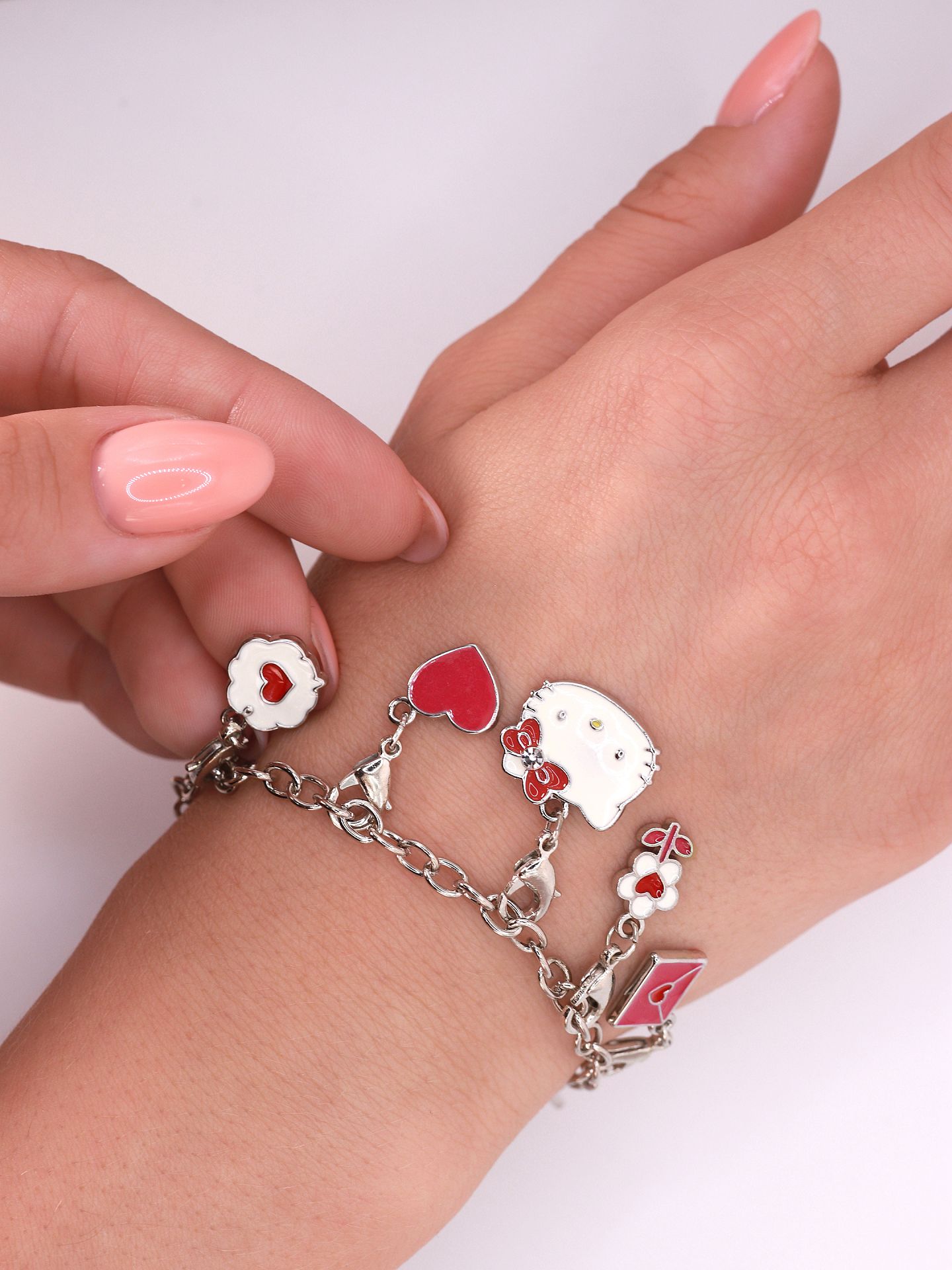 Браслет на руку с подвесками — отличный аксессуар для поклонников поп-культуры. Он украшен 5-ю милыми подвесками. Бижутерия Hello Kitty станет настоящей изюминкой образа. Стильный браслет для девочек выполнен в цвете серебро, что придаёт ему элегантности и универсальности. Подвески добавляют двойной эффект к этому милому аксессуару.