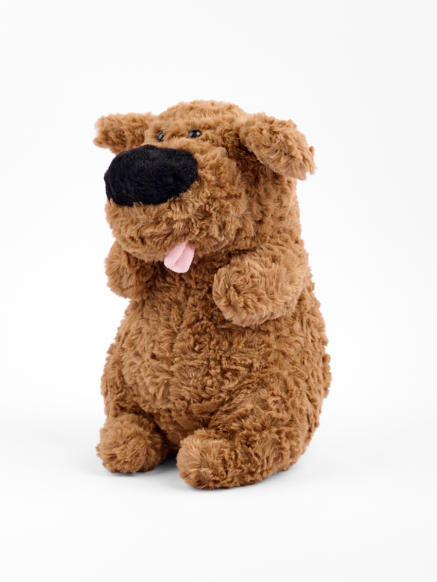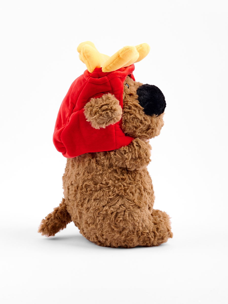 Игрушка сделана из приятного на ощупь плюша светло-коричневого цвета, что придает ей мягкость и уют. Одной из самых оригинальных особенностей игрушки является шапка в виде картошки фри. Этот креативный дизайн делает игрушку особенной. Шапка прочно закреплена, но съемная, что позволяет использовать ее как часть игры. Игрушка имеет интерактивный элемент — язык, который можно потянуть на себя. Когда язык отпускается, он возвращается обратно, вызывая улыбку у каждого. Эта особенность делает игрушку интересной для детей: они смогут развивать моторику рук и весело проводить время.