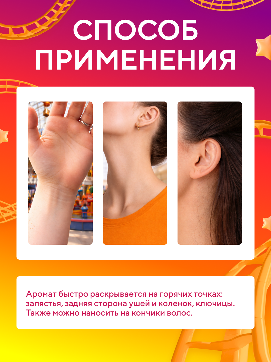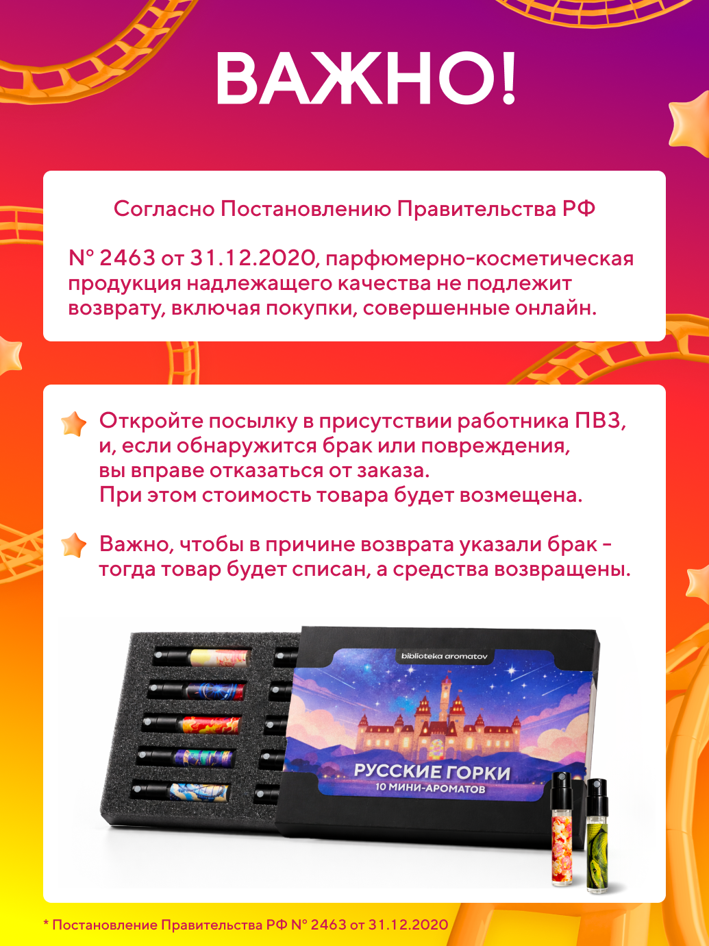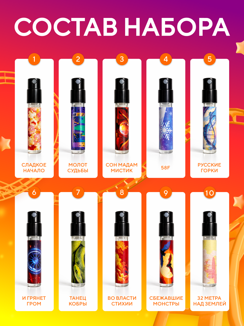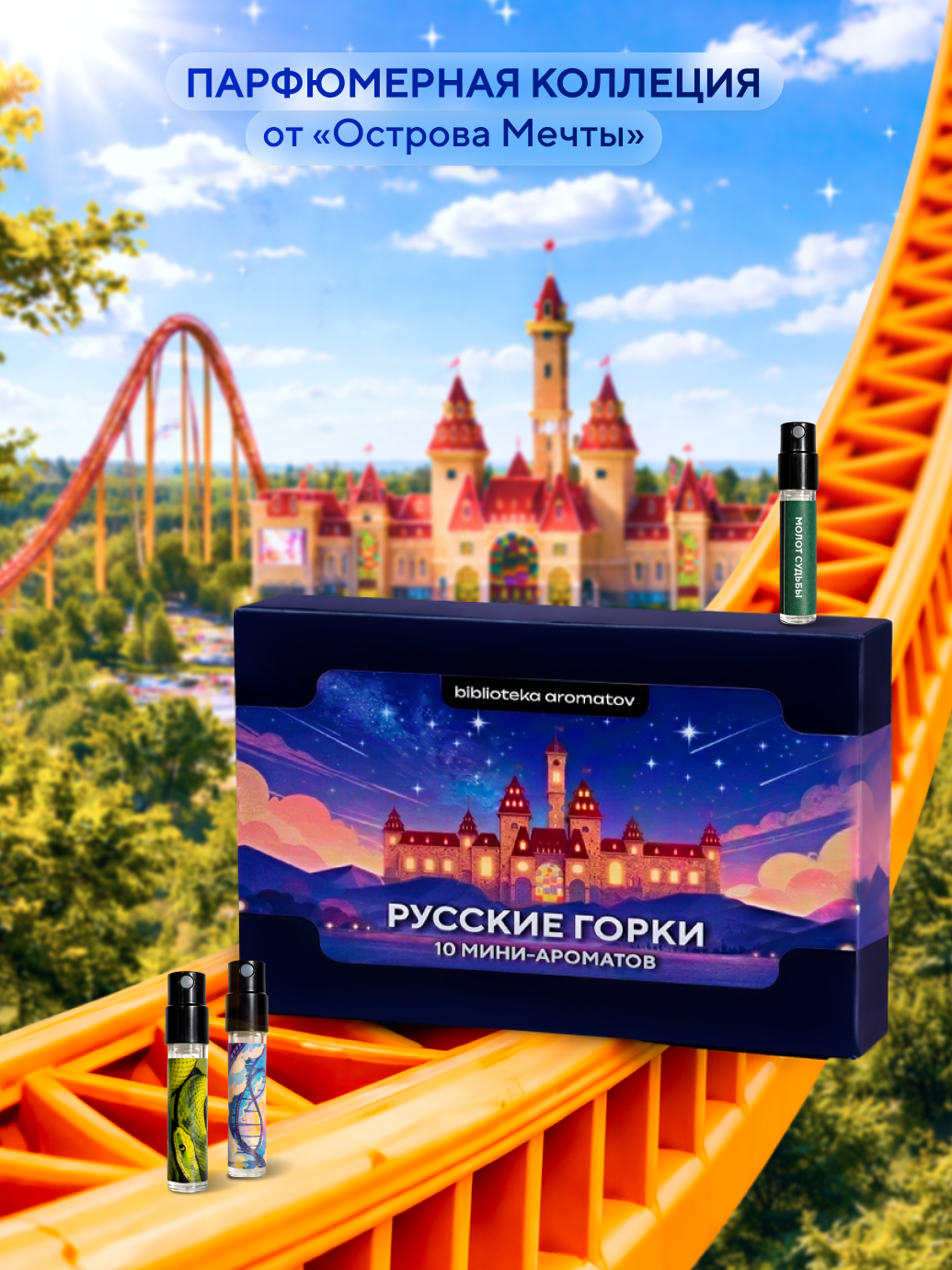 Представляем парфюмерную коллекцию «Русские горки» — 10 уникальных ароматов, вдохновлённых нашими аттракционами и шоу. От невероятного «Замка Снежной королевы» до загадок «Сна мадам Мистик» — каждый аромат превращается в ваше личное воспоминание.
