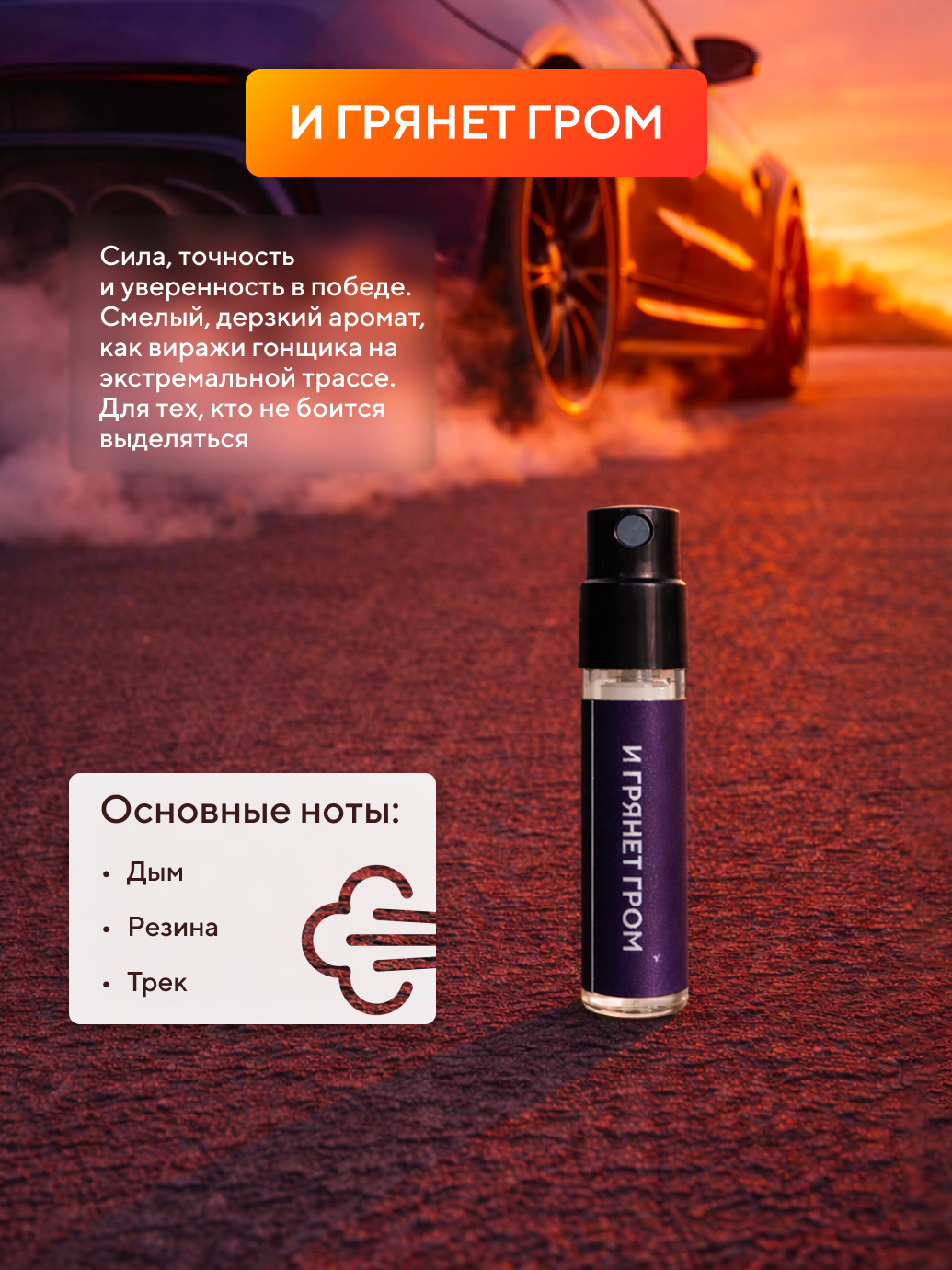 Основные ноты: пустая трасса, разогретая резина покрышек, мускусная сладость кожи