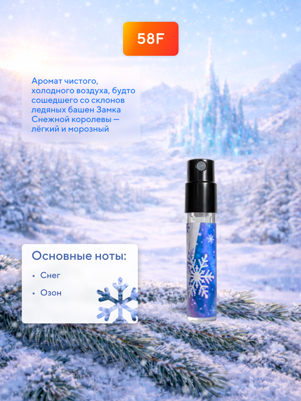 Аромат чистого, хрустящего снега, будто сошедшего прямо со склонов ледяных башен Замка Снежной королевы — лёгкий, морозный и завораживающе прозрачный.