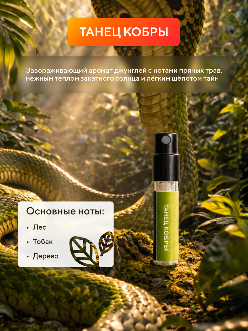 Завораживающий аромат джунглей с нотами пряных трав, нежным теплом закатного солнца и лёгким шёпотом тайны. Он гипнотизирует, окутывает вибрацией ритма и мистикой.