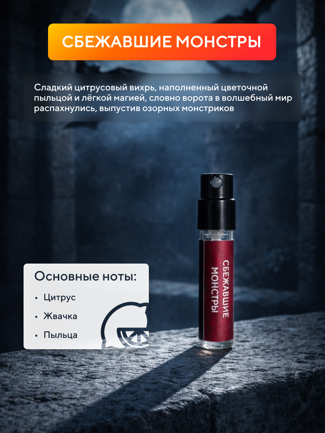 Cладкий цитрусовый вихрь, полный искристого веселья и шалостей. В нём слышится аромат цветочной пыльцы и лёгкой магии, как будто кто-то распахнул двери в волшебный мир и выпустил на свободу озорных монстриков. Этот аромат — приглашение в мир смеха, приключений и сладкого хаоса.