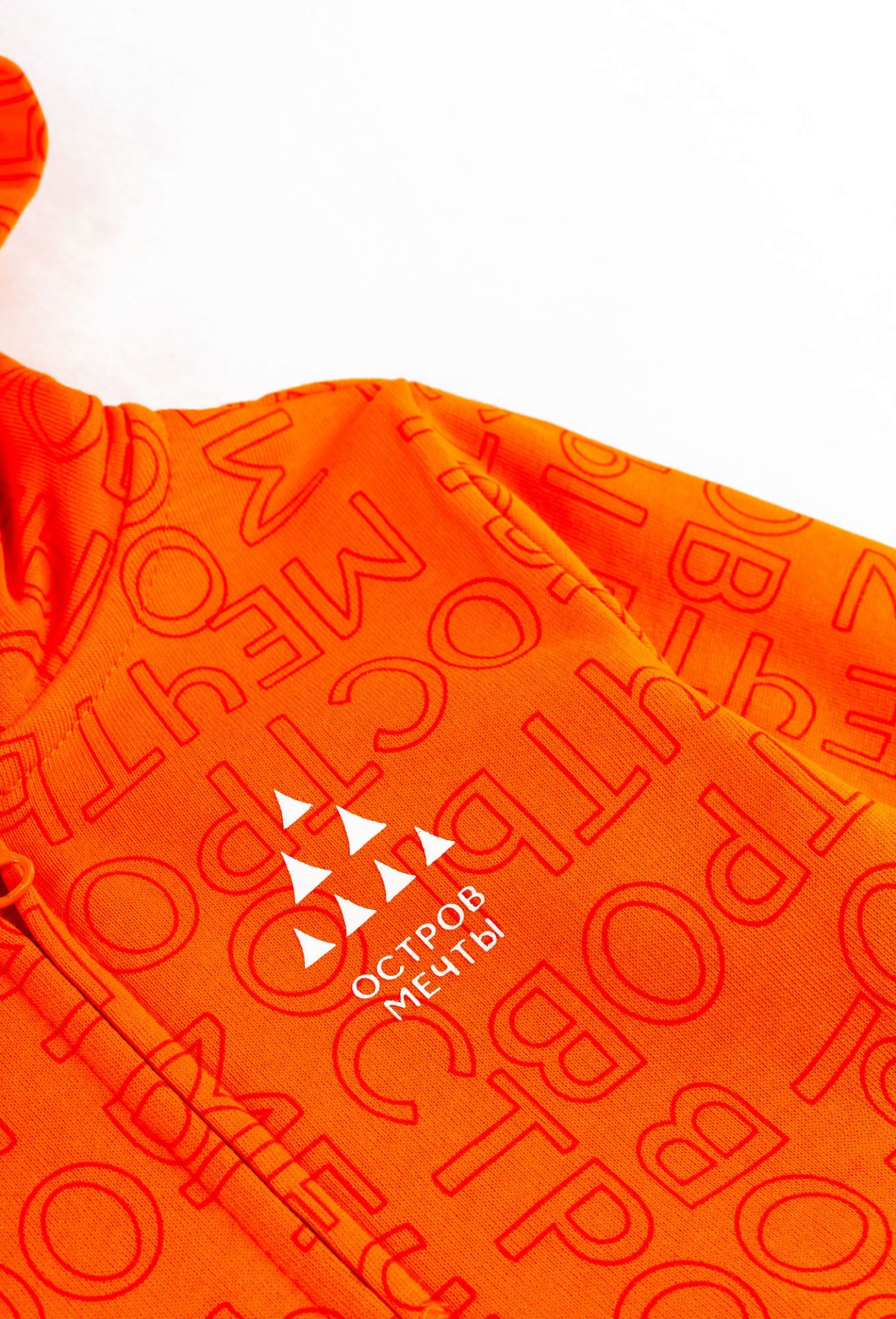 Дизайн: Толстовка выполнена в насыщенном оранжевом цвете, который привлекает внимание и поднимает настроение. На изделии расположено яркий логотип Острова мечты, что делает её уникальной и легко узнаваемой.